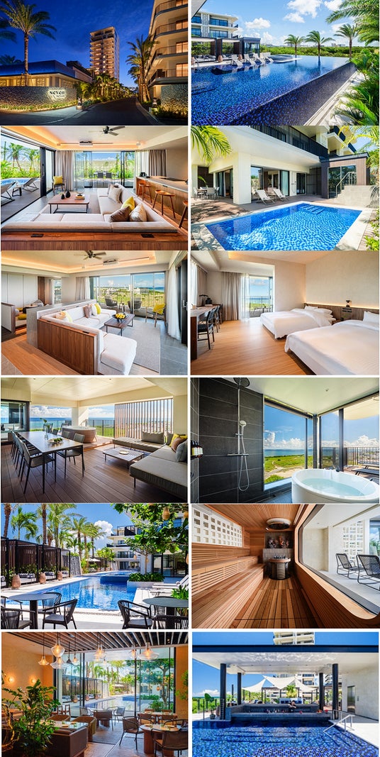 1段目左:外観、1段目右:インフィニティプール、2段目:ザ・セブン プールスイート(183.9平方メートル ) ※うち 94.2平方メートル はテラス、3段目・4段目:ザ・セブン オーシャンスイート(204平方メートル ) ※うち 100.1平方メートル はテラス、5段目・6段目:施設(プール、サウナ、レストラン、プールバー)※2024年7月撮影