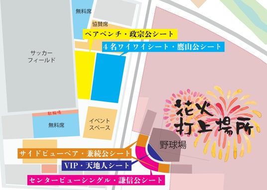 なかでも、演武などのパフォーマンスを直接観覧でき、戦シーンの特殊演出と大迫力の花火を楽しめるスタジアム内有料観覧席がおすすめ!