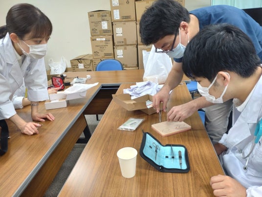 帯同した本学 平岡医師(中央)の指導で縫合体験