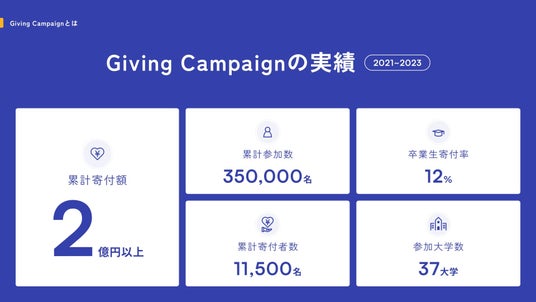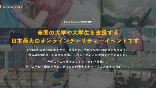 Giving Campaignは、日本全国の大学生が、部活動・サークル・研究室などの課外活動団体ごとに、自身の活動をSNS上やOBOGネットワークを通じて発信し、活動に対して応援や支援を募る国内最大級のオンラインイベントです。 2021年冬に第1回を東京大学で開催し、今回で5回目の開催となります。これまでに、累計37大学が参画し、約35万人の方にご参加いただき、累計2億円以上の寄付を創出しました。