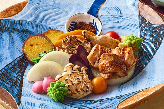 また、ヘルシーな肉質ながら、しっかりとしたコクや歯応えもある、新潟県の銘柄鶏「越の鶏」を、醤油ベースの甘辛い特製ダレで照り焼きにしてご用意いたします。照り焼きの甘みと香ばしさが絶妙に絡み合い、ジューシーで柔らかく仕上げた逸品は、“シルクスウィート”の他、旬のきのこや根菜など季節の彩り野菜の炭火焼きとも相性抜群です。