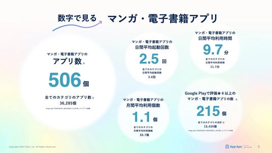 マンガ・電子書籍アプリのアプリ数、起動回数、利用時間などの基本データをまとめました。