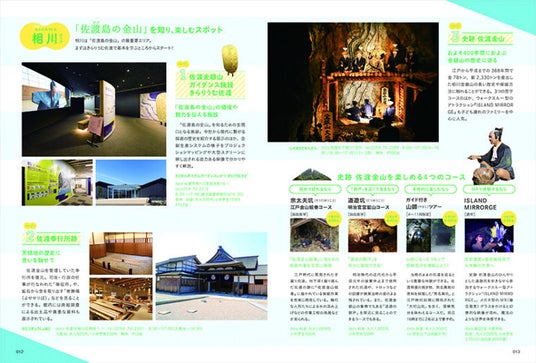 「佐渡島(さど)の金山」について分かりやすくまとめ、訪れるべきスポットをまとめた特集記事をはじめ、全国の方たちに旅で訪れてほしい観光スポットや、佐渡ならではのグルメが味わえる飲食店、カフェや日帰り温泉、佐渡ならではのアクティビティ情報などをたっぷり収録しています。