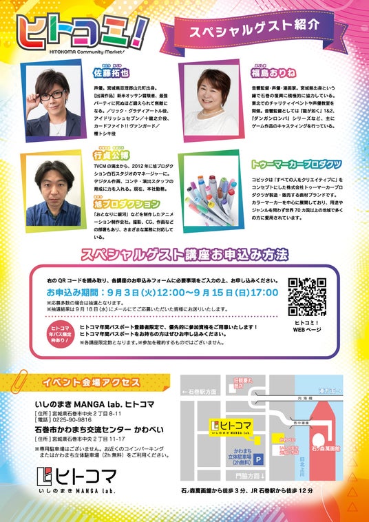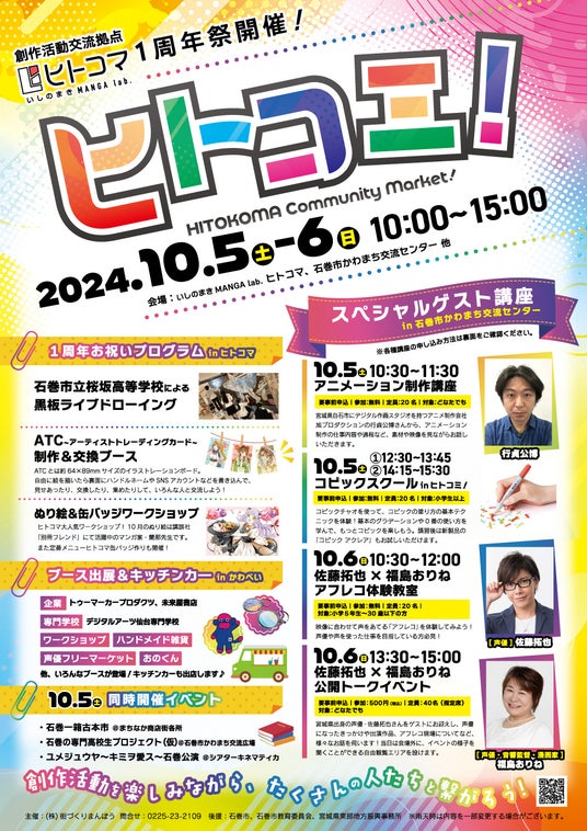 石巻の市街地に昨年オープンした創作活動交流拠点『いしのまきMANGA lab.ヒトコマ』の1周年イベントが行われます。今回はヒトコマの他にもかわべいでの両日にかけてイベントが開催されます。当日は通常ワークショップはもちろん、イベント限定の教室や展示、企業やアーティストによる出展も行われ、特別ゲストも登場します。創作活動を楽しみながら、たくさんの人たちと繋がろう!