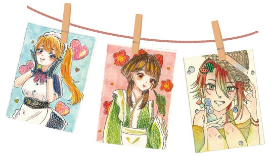 ATC(アーティストトレーテ゛ィンク゛カート゛)とは約64×89mmサイズのイラストレーションボード。自由に絵を描いたら裏面にハンドルネームやSNSアカウントなどを書き込んで、見せあったり、交換したり、集めたりして、いろんな人と交流しよう!