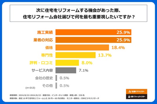 業者に依頼して住宅をリフォームした経験のある方が、次に住宅をリフォームする機会があった際、業者選びで重要視するのは「施行実績」と「業者の対応」