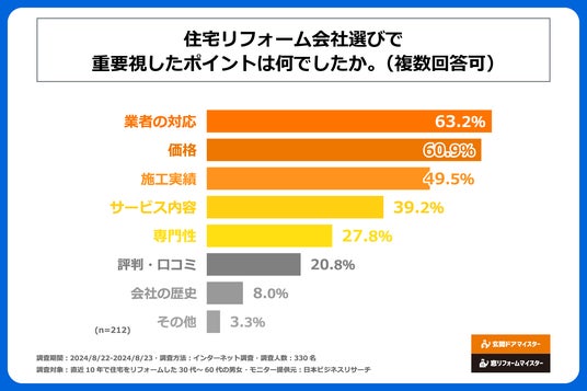 続いて、住宅をリフォームした結果に「満足している」および「非常に満足している」と回答された方に「住宅リフォーム会社選びで重要視したポイントは何だったか」を尋ねました。この設問への回答で多かったのは、1位が「業者の対応」で63.2%、2位が「価格」で60.9%、3位が「施工実績」で49.5%という結果になりました。この結果から住宅リフォーム会社選びでは「施工実績」よりも「担当者の対応」や「価格」を重要視される方が多い、という実態が明らかになりました。