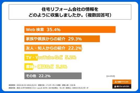 また、住宅をリフォームした結果に「満足している」および「非常に満足している」と回答された方に「住宅リフォーム会社の情報をどのように収集したか」を尋ねました。この設問の回答で多かったのは、1位が「Web検索」で35.4%、2位が「家族や親族からの紹介」で29.3%、3位が「友人・知人からの紹介」で22.2%となりました。この結果から、住宅リフォーム会社の情報を収集する手段として最も多いものは「Web検索」であるものの、人づての紹介により情報収集をしている方も一定数いることがわかりました。