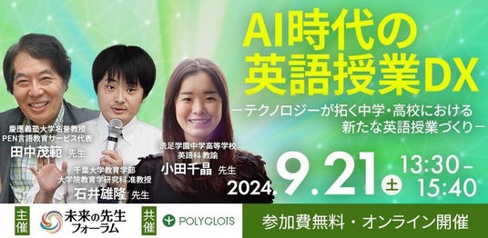 株式会社ポリグロッツ(所在地:東京都新宿区、代表取締役社長:山口隼也)は、未来の先生フォーラム(代表理事:宮田純也)と共催し、「AI時代の英語授業DX-テクノロジーが拓く中学・高校における新たな英語授業づくり」をテーマとしたオンラインイベントを、2024年9月21日(土)に開催いたします。