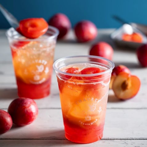 信州須坂で太陽の恵をたっぷり浴びて育てられた、プラム「太陽」。濃い紅色につやめき丸々として、香りのよい完熟プラムは、しっかりと甘くほのかな酸味が広がるジューシーな味わいが魅力。豊富な果汁と強い甘さを生かした自家製のコンポートに、クオリティーシーズン・ウバの華やかな香りを合わせて爽やかなプラムティーソーダにしました。太陽プラムのコンポートを丸ごと浮かべた、果実感たっぷりのティーソーダです。