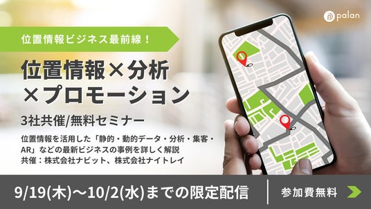 WebARサービスを提供する株式会社palan (本社:東京都渋谷区、代表取締役:齋藤 瑛史)は、株式会社ナビット(東京都千代田区九段南、代表取締役:福井泰代)主催のウェビナー「位置情報×分析×プロモーション 位置情報ビジネス最前線!」に登壇いたします。