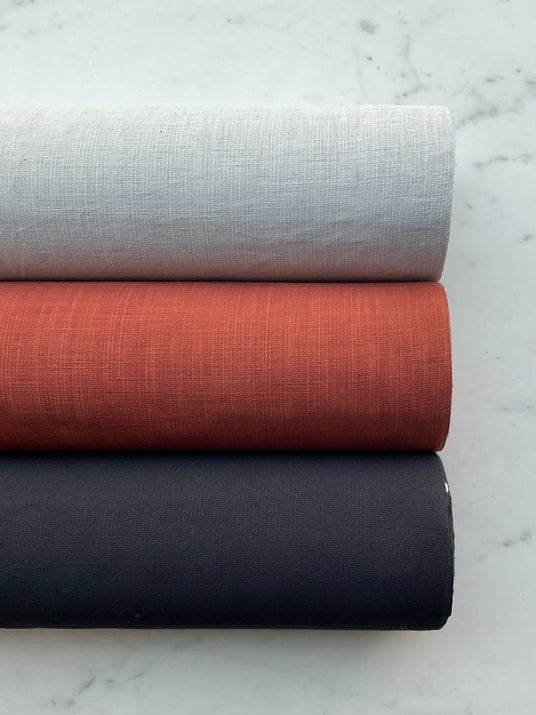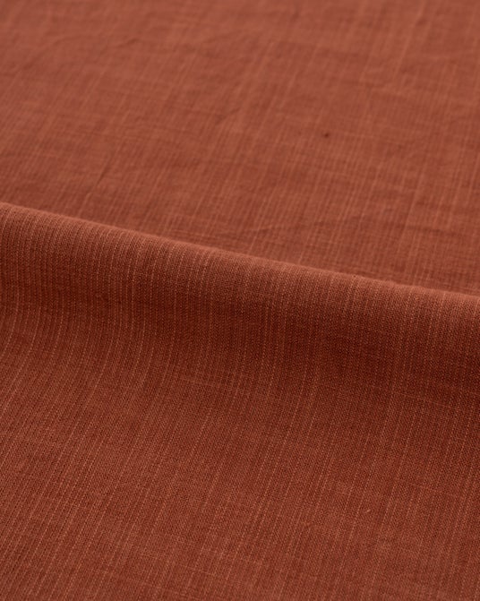 実は、片貝木綿の定番である縞や格子よりも難しいのは無地とのこと。新作3色の中でも、特に色合わせで苦労したのがこの橙色。濃いめの橙色がこっくりした雰囲気になるよう、一種の「コク」のようなものを感じられるように、意識して染めていただいています。