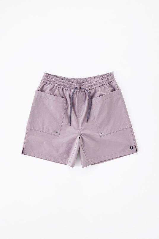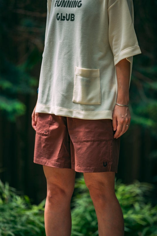 フロントにある大型ポケットがデザインのポイントとなっています。。後部には右側にパッチポケットがつき、中央にはジッパー付きポケットが付きます。ジッパー付きの方は、携帯電話や貴重品を収納するのにも便利ですし、またパッカブル仕様となっていまして、携帯性を高めます。トレイルでも日常でも旅に持っていくのにも、軽い着心地の毎日使えるボックス型ショーツとなっています。