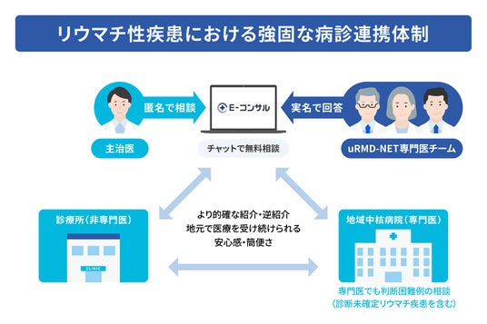 株式会社Mediiと札幌医科大学附属病院は、リウマチ性疾患の早期診断・治療最適化のための強固な病診連携体制構築を目指し協働します。北海道・東北地区の大学病院の整形外科・リウマチ膠原病内科を中心としたネットワーク「uRMD-NET」( https://web.sapmed.ac.jp/urmds-net/onlineconsultation.html )において、Mediiの医師専用オンライン専門医相談サービス「E-コンサル」を活用し、リウマチ性疾患の診断や治療方針を「uRMD-NET」の専門医に無料相談できる仕組みを北海道・東北地区の医師に提供します。