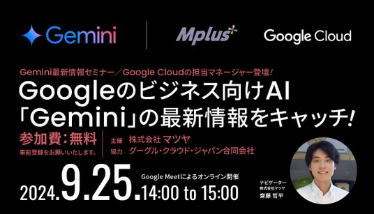 株式会社マツヤ(本社:栃木県鹿沼市 代表:猪野 聖一)は、2024年9月25日(水)14時より、注目のAI機能「Gemini for Google Workspace」の最新情報と活用事例を紹介する無料ウェビナーを開催します。グーグル・クラウド・ジャパンの Google Workspace Customer Success Manager が登壇し、Gemini の導入メリットや活用方法を詳しく解説します。