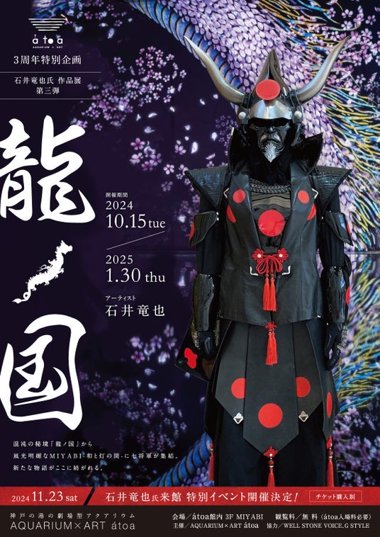 AQUARIUM×ART atoa(神戸市中央区、以下アトア)では、アーティスト石井竜也氏による作品展第三弾として、企画展「龍ノ国」を2024年10月15日(火曜)から2025年1月30日(木曜)まで開催します。