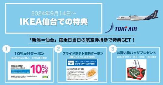 新潟拠点の地域航空会社トキエア株式会社(本社:新潟県新潟市 代表取締役:長谷川政樹、以下トキエア)は、2024年8月よりトキエアご搭乗済み搭乗券の呈示でお得な特典が貰えるキャンペーンを開始したことをお知らせいたします。これまでに、新潟・佐渡の旬の食材が楽しめる「よね蔵グループ」・新潟みなとのマルシェ「ピアBandai」・佐渡島両津港のカフェ「maSanicoffee」とのキャンペーンを開始しており、2024年9月14日からはIKEA仙台と新たに連携を開始します。