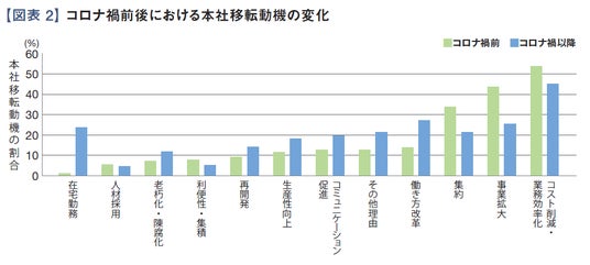 しかし、コロナ禍以降は、コスト削減・業務効率化が依然として最も多い動機でありながら、その割合は45.2%に減少した。一方で、在宅勤務を理由とする移転の割合は、コロナ禍前の1.1%から23.7%へと大幅に増加した。また、働き方改革を理由とする移転も13.8%から27.1%に増加し、生産性向上(11.6%から18.1%)とコミュニケーション促進(12.7%から19.8%)を挙げる企業の割合も増加した。