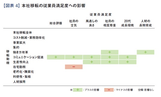 まず、本社移転全体の影響を検討した結果、従業員満足度には顕著な変化が見られなかった【図表 4】。これは、総合評価スコアだけでなく、個別の評価項目においても同様であり、単に本社を移転するだけでは、従業員満足度が向上しないことを示唆している。