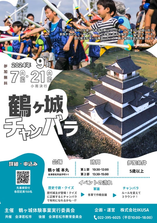 あそび総合カンパニー株式会社IKUSA(本社:東京都豊島区、代表取締役:赤坂大樹)は、2024年9月21日(土)に鶴ヶ城体験事業実行委員会が主催するイベント「チャンバラ合戦 in 鶴ヶ城」を企画運営します。コロナ明け5年ぶりの開催です。