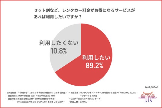 「セット割など、レンタカー料金がお得になるサービスがあれば利用したいですか?」と質問したところ、『利用したい(89.2%)』『利用したくない(10.8%)』という回答結果になりました。