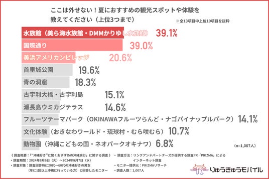 「ここは外せない!夏におすすめの観光スポットや体験を教えてください(上位3つまで)」と質問したところ、『水族館(美ら海水族館・DMMかりゆし水族館)(39.1%)』と回答した方が最も多く、次いで『国際通り(39.0%)』『美浜アメリカンビレッジ(20.6%)』となりました。