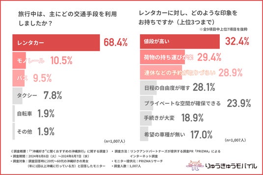 レンタカー利用は荷物の持ち運びが楽である一方で、3割以上の人が価格や旅行客が集中する連休中の予約の取りづらさなどに懸念を抱いていることが示されました。