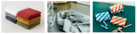 左:FLUFFY TOWEL(フラッフィータオル)ブランドイメージの落ち着いた色合いのバスタオル、フェイスタオル。土壌・水質・農薬などの面で環境へ配慮した農園の綿花を使用し、タオルに仕上げる行程での電力は98%を太陽光電力でまかなう工場 を選定するなど、「品質」だけでなく「サステナビリティ」にもフォーカスした商品づくりを行いました。 中央:金属加工産業で有名な新潟県燕市で作られたカトラリー。切断や研磨、洗浄などたくさんの工程を、分業された工場で、1つひとつ手作りで製造しています。Standard Productsで人気の定番商品です。 右:知的障がいを持つ方々のみの生産ラインで作られる、日本理化学工業の「キットパス」。窓ガラスに描いても消せる筆記具で、小さなお子様のお絵かきから、本格的な画材としてもおすすめです。