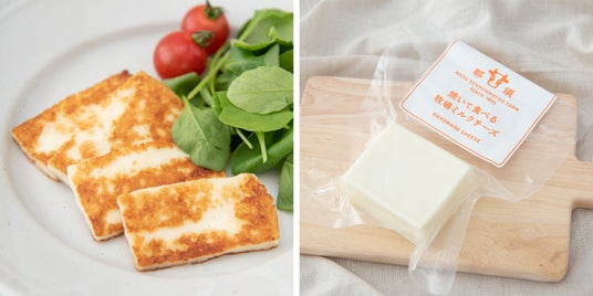 このチーズは、地中海のキプロス島で親しまれている、ハロウミチーズをモチーフに、千本松牧場独自の製法で仕上げています。自社牧場で育てた牛の新鮮なミルクを使用し、酸味のない自然なミルクの風味が楽しめるこのチーズは、日本では希少なハロウミチーズに乳酸菌をプラスし、千本松牧場ならではの風味と品質を追求した商品として開発しました。他ではなかなか味わえない特別なチーズに仕上げています。