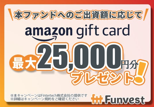 本ファンドへ出資していただいた投資家の皆様を対象として、出資額に応じて最大25,000円分のAmazonギフトカードをプレゼントするキャンペーンも併せて実施いたします。