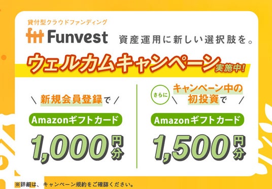 新規会員登録・ファンドへの初投資で、Amazonギフトカードを合計最大2,500円分プレゼント!