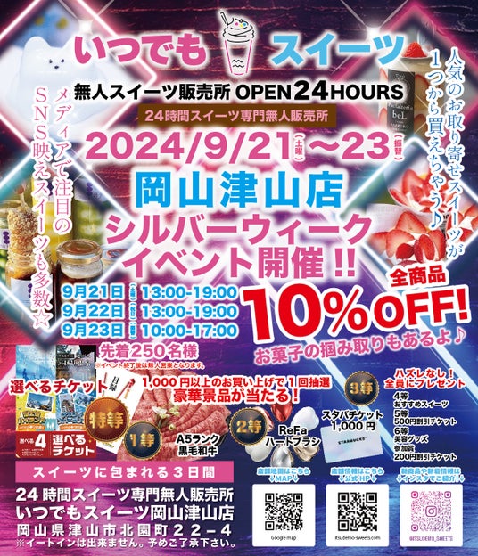 全国100店舗の美容サロンを展開する株式会社Createur(クレアトゥール)(所在地:広島県中区、代表取 締役:⼄津健太朗)に併設しオープンしている、お取り寄せスイーツを手軽に一つから購入できる!をコ ンセプトにした~無人スイーツ販売店~「いつでもスイーツ岡山津山店/岡山県津山市」にてシルバーウィークイベントを開催致します。