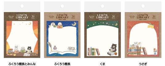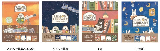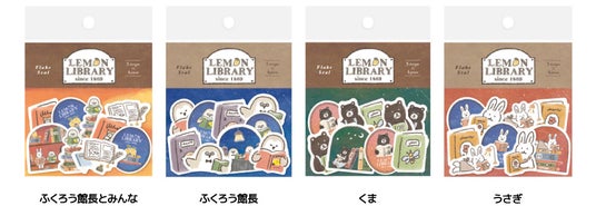 今回のシリーズ「LEMON LIBRARY」は、すでに販売中の「BOOK CAFE Lemon」「Shop & Cafe HONEY」「FLOWER SHOP Little Garden」に続く4つ目のシリーズとなり、第1弾として、和風フレークシール、メモパッド、付箋、箔押しシールシートの4アイテムを、それぞれ4種類のデザインで発売します。