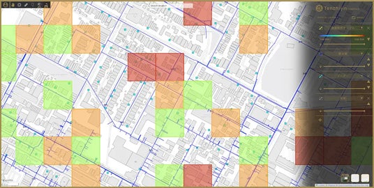 画像は「天地人コンパス 宇宙水道局」のサンプルとなります。色のついている場所は水道管の漏水リスクが相対的に高い場所を指しています。漏水リスクの高低を5段階に分けており、赤色は漏水リスクの最も高い場所を指しています。