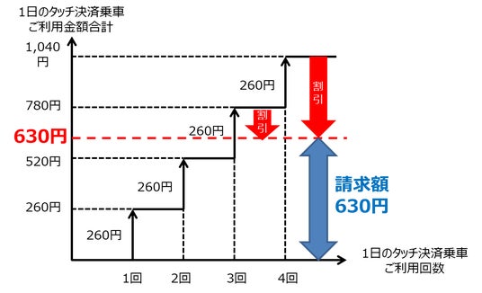 『上限運賃適用サービス』は、日単位のご利用金額に上限を設定し、上限に達した場合はそれ以上のお支払いが不要となる仕組みです。1日最大 大人630 円、小児320円にてご利用いただけます。