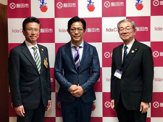 画像左から飯田市長、弊社取締役社長、飯田市教育委員会教育長