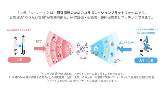 企業の「自社でできない実験」が実施できるラボ・委託先・技術保有者とマッチングできるサービスです。