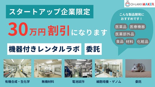 スタートアップ企業様限定で、機器付きレンタルラボや委託試験等のご利用金額から30万円を割引するキャンペーンを実施中です。ぜひこの機会にお問い合わせください。