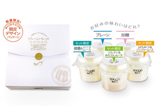 40周年特別企画として「プレーンヨーグルト」のおいしさや楽しみ方をご提案するため、食べ比べセットをご用意!プレーンヨーグルトをベースにひと手間かけた5種のヨーグルトを詰合せています。それぞれの味を食べ比べして、ヨーグルトの魅力を楽しみませんか?