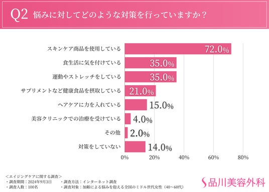 続いて、悩みに対してどのような対策を行っているか伺ったところ、「スキンケア商品を使用している(72.0%)」と回答した方が最も多いことがわかりました。