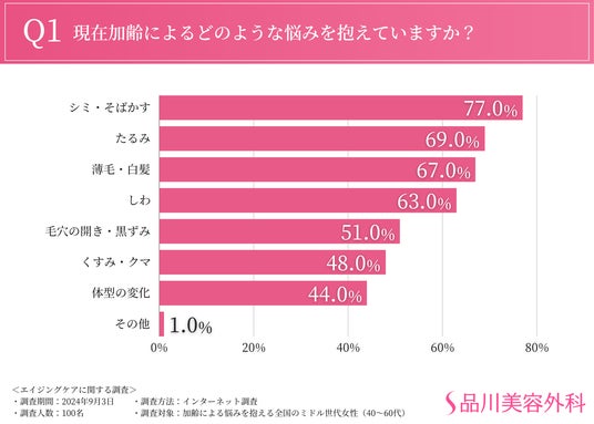 はじめに、現在加齢によるどのような悩みを抱えているか伺ったところ、「シミ・そばかす(77.0%)」「たるみ(69.0%)」「薄毛・白髪(67.0%)」という回答が集まりました。