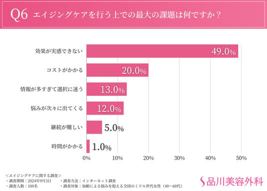 次に、エイジングケアを行う上での最大の課題は何なのか伺ったところ、「効果が実感できない(49.0%)」「コストがかかる(20.0%)」という回答が集まりました。