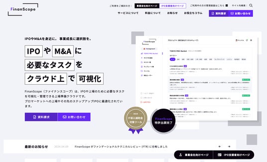 FinanScope(ファイナンスコープ)は、IPO や上場のために必要なタスクを可視化・管理できる上場準備クラウドです。特にプロマーケットへの上場やその先のステップアップ IPO に最適化されており、企業の成長戦略を支援します。