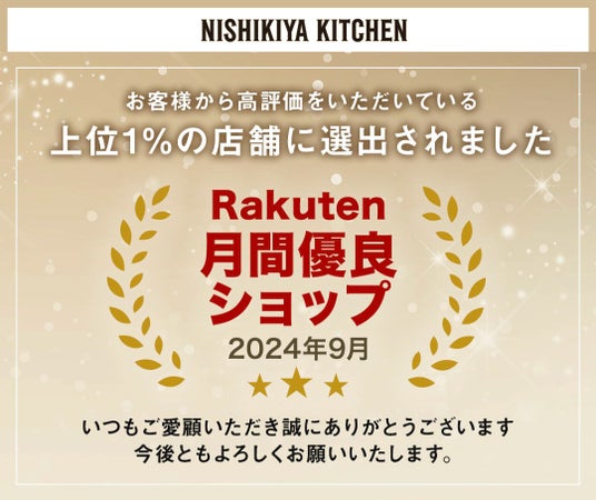 楽天市場に出店している約 57,000 店舗の中から、お客様から高い評価を得た上位 1%の店舗が月間優良ショップとして毎月選出されます。ショップレビューの平均評価・件数、店舗チェックシートの「店舗都合キャンセルの少なさ」「低商品レビューの少なさ」「ユーザクレームの少なさ」などから、ジャンル傾向なども加味して選出されるもので、ニシキヤキッチンは2024年1月度以来、2度目の受賞です。
