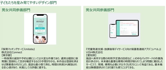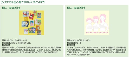安全かつ楽しく育児に取り組める工夫がなされたもの。保育園、学校、自治体、地域などで利用されるものも含む。また、子育て期の男女が、育児や仕事、地域との交流などに積極的に参加するための新たな発想、工夫、手法があるもの。
