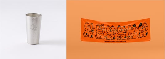 (左)能作ビアジョッキ ツギノテオリジナルver.、(右)ツギノテオリジナル手拭いなどMakuake限定のオリジナル商品が盛り沢山!