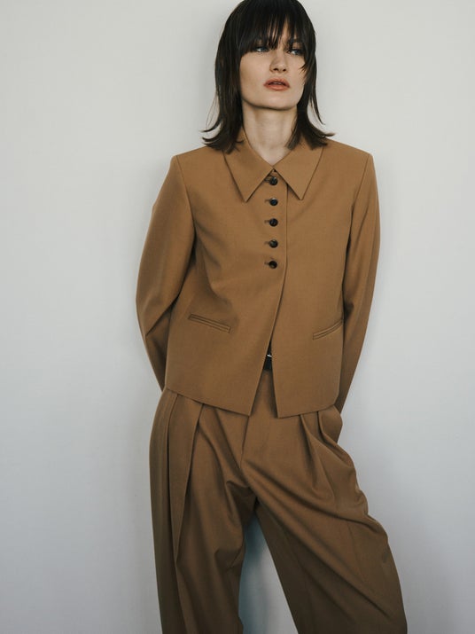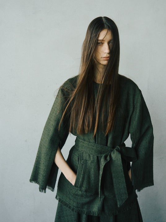 POP UP SHOPでは、イタリアのテキスタイルメーカーBONOTTO社のメリノウールギャバを使用した、シングルブレストのジャケットとワイドレッグシルエットの2タックパンツ、FERLA社のうっとりするような柔らかさとヌメリ感が特徴的な素材を使ったプリンスオブウェールズチェックのシングルブレストジャケットとリラックスフィットパンツ、CREVACUORE社のペーパーライクなウールツィードで仕立てたベルテッドツィードジャケットとタック・ボリュームスカートといった、纏った時に丁寧な仕立て、素材へのこだわりを感じていただけるセットアップが揃います。