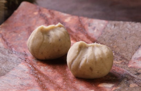 ご飯を白餡で包み、くるみと栗の甘露煮を使っています。