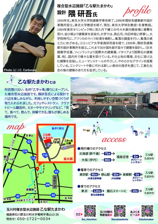 福島県玉川村(村長:須釡泰一)玉川村では、乙字ヶ滝周辺について、「玉川村乙字ヶ滝かわまちづくり計画(2020年3月13日登録)」に基づき、国(国土交通省)、福島県、周辺市町村、民間事業者と相互に連携、協力して環境整備を進めてまいりました。この度、交流人口、関係人口の拡大を目指し、阿武隈川のほとりに立つ空き店舗を活用し、かわまちづくりの拠点施設となる「玉川村複合型水辺施設 乙な駅たまかわ」を整備いたしました。この建物は、国立競技場などの設計で知られる隈研吾氏が設計した建物で、もともと東日本大震災以降、空き店舗となっており、村ではこの建物を「地域資源」として活用していくため、設計・建設・運営・資金調達を同時に行う「DBFO方式」により整備し、設計当初から運営予定の民間事業者が関わり、お客様が集いやすい、利用しやすい空間づくりに取り組みました。