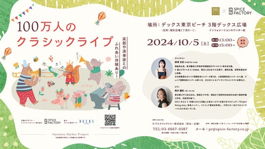 スパイスファクトリー主催による「100万人のクラシックライブ」は、2024年10月5日(土)にデックス東京ビーチ3階デックス広場で開催されます。本イベントは地域との交流を深める取り組みの一環であり、会場協力として、デックス東京ビーチ(運営会社:東急不動産SCマネジメント株式会社)にご協力いただいております。